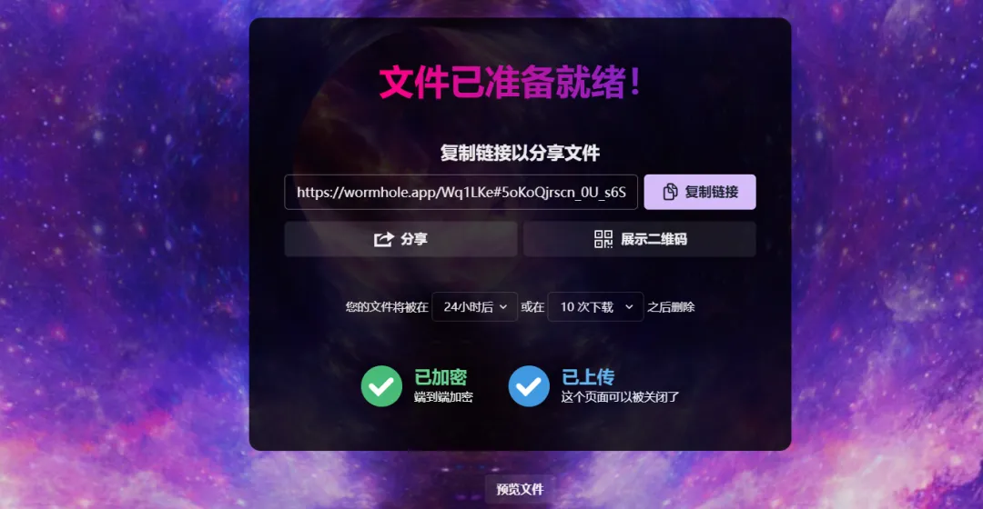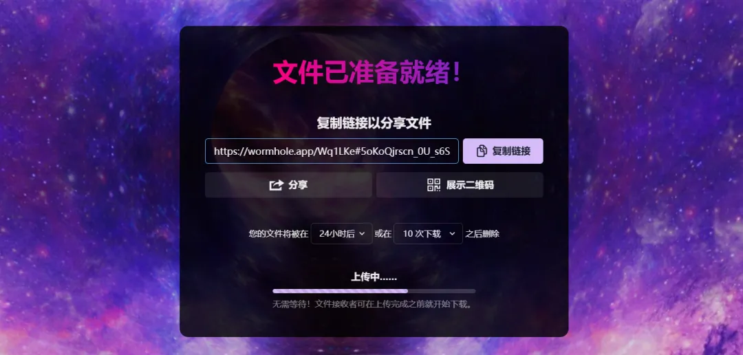无注册门槛,操作极简零学习成本:无需注册账号、无需绑定手机号,打开wormhole.app官网即可使用,支持拖拽文件上传,操作简单直观;上传完成后自动生成加密分享链接,可复制链接或生成二维码分享,接收方点击链接即可直接下载,无需安装任何软件、无需登录,3步即可完成文件传输,小白也能快速上手。