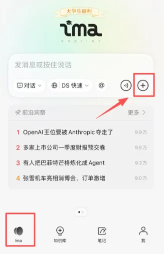 1. 打开 IMA 对话页:进入 IMA 首页,在对话输入框中点击右侧“+”