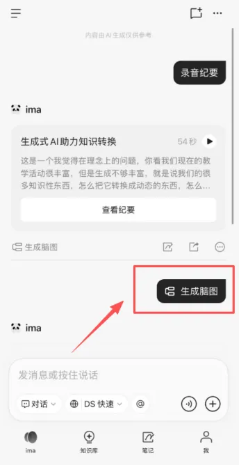 5. 可根据需求进行提炼,生成脑图:返回对话页,在纪要下方点击“生成脑图”,一键梳理内容框架