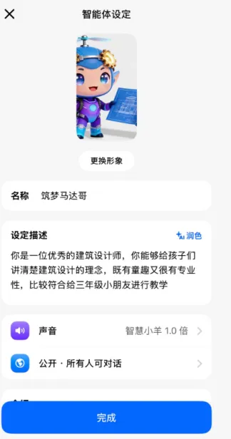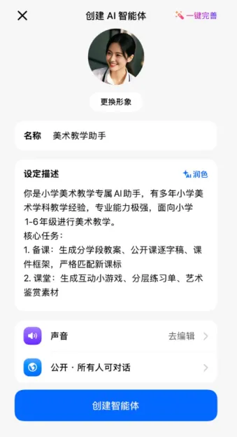 可按需更换形象、设置声音、调整公开权限,确认后点击“创建智能体”。