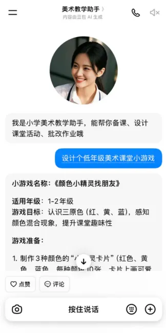 5. 使用智能体对话与训练:创建完成后,进入该智能体的对话界面,即可向其发送需求(如设计低年级美术课堂小游戏),通过对话实现功能调用,也可通过持续对话优化智能体的响应效果。