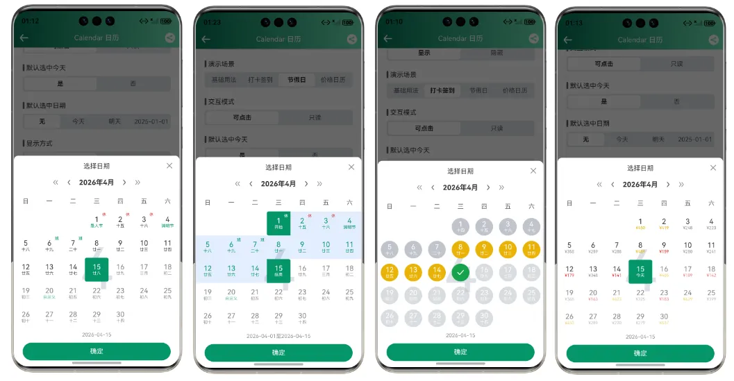 uni-app全能日历组件,支持农历、酒店预订、打卡签到、价格日历多种场景