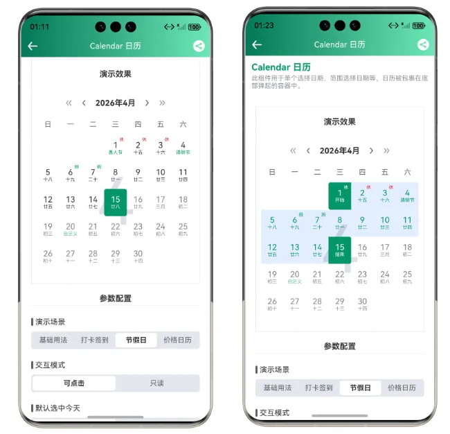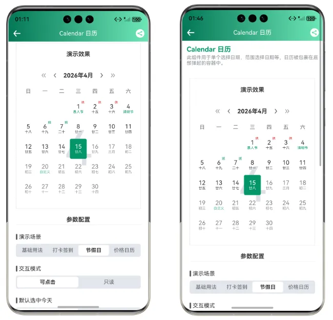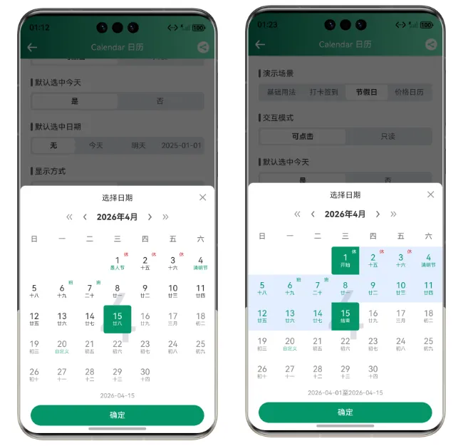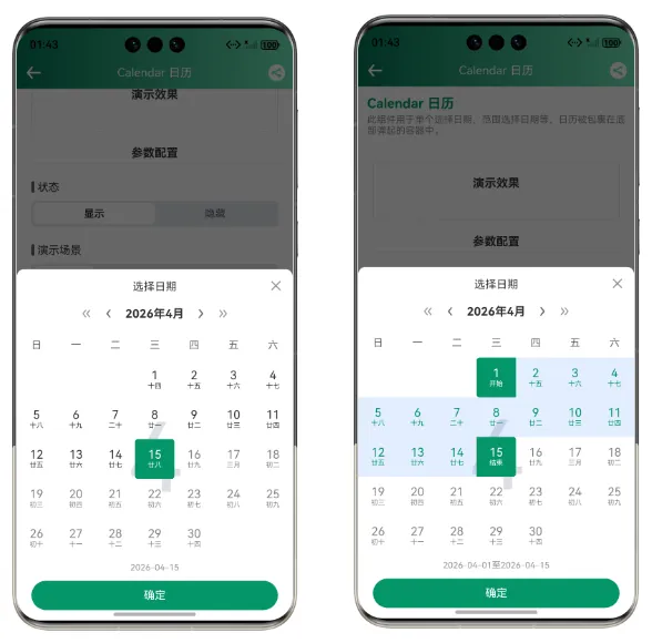 Calendar 组件内置了农历计算功能,开启后会自动显示农历日期。