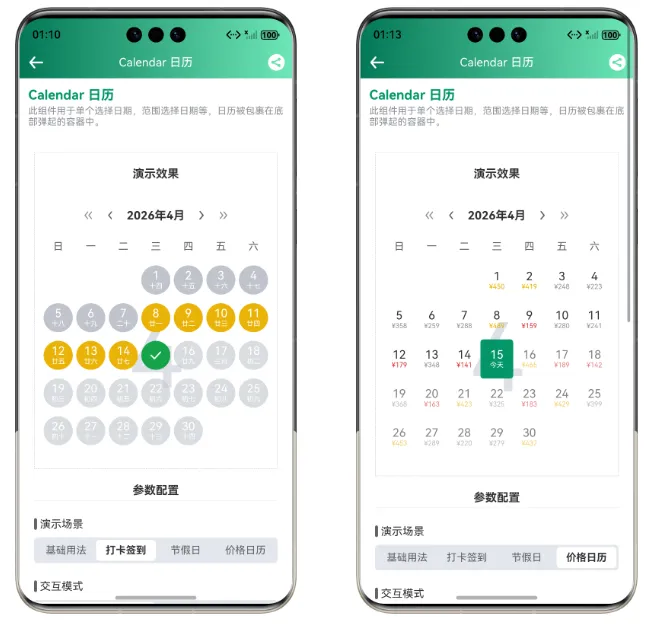 打卡签到日历也是近期咨询我比较多的功能,Calendar 组件专门为此设计了打卡模式。