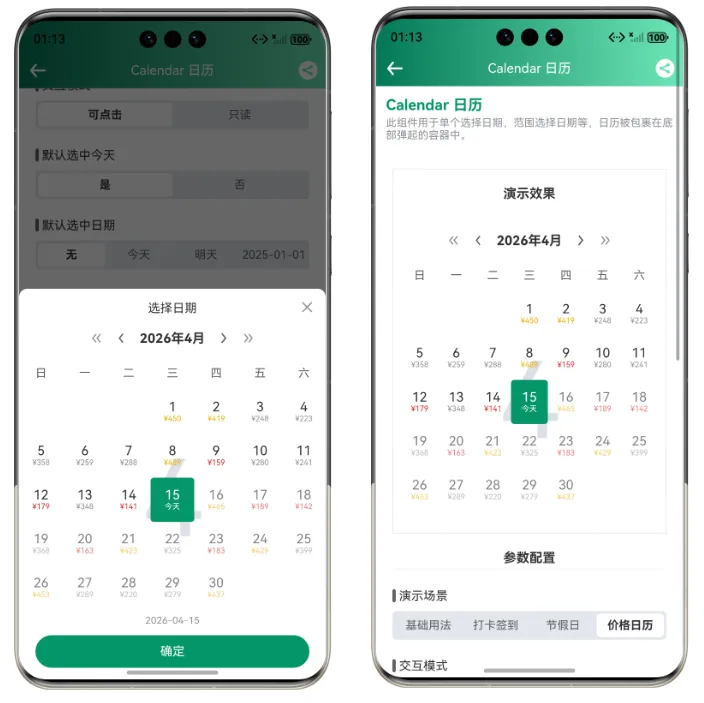 ✅ 自定义日期内容插槽,适用于价格日历等场景
