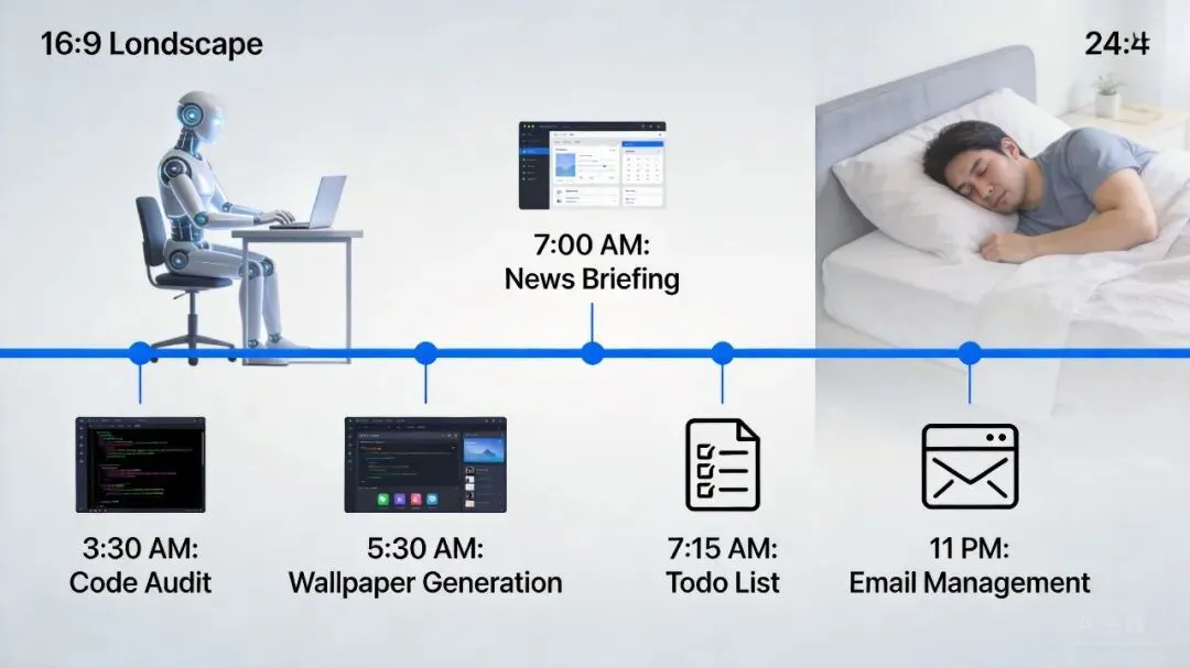 凌晨 3:30 自动起来跑代码扫描,5:30 推送”历史上的今天”到桌面,7:00 生成晨间简报……
