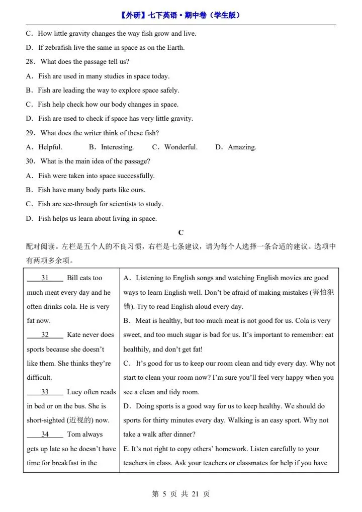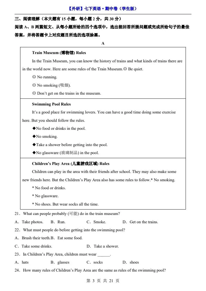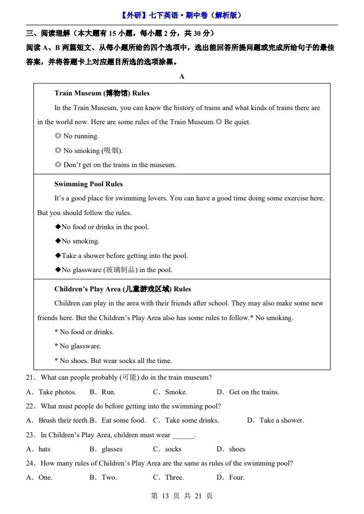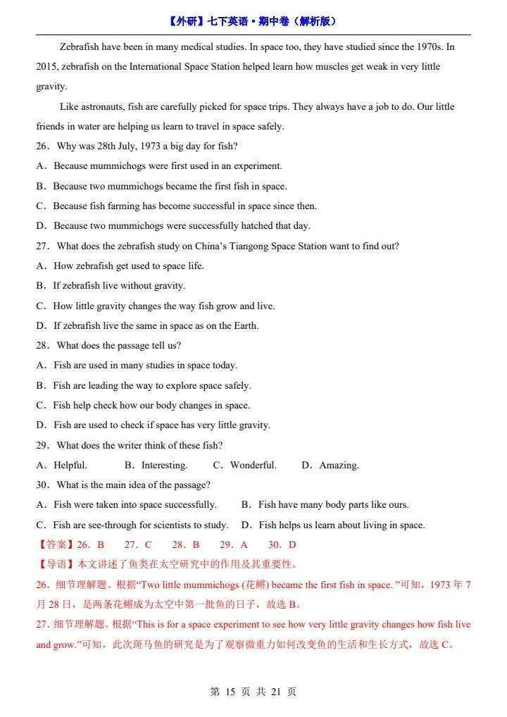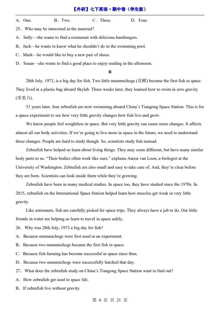 26新七下外研版英语期中试卷(答案+答题卡)完整电子版可打印