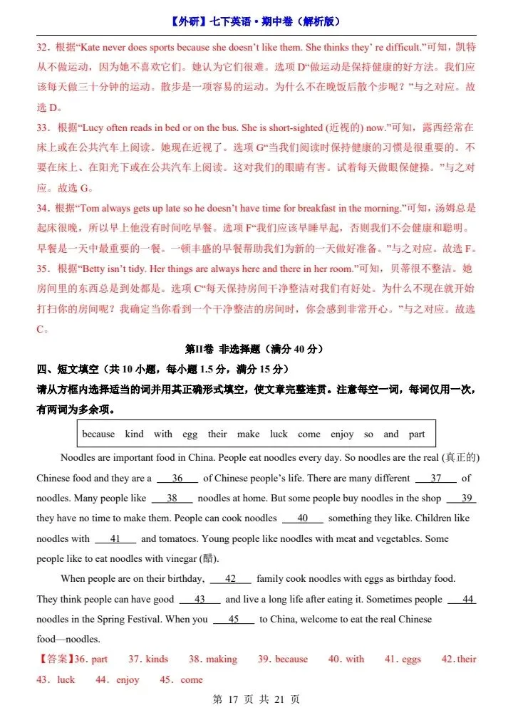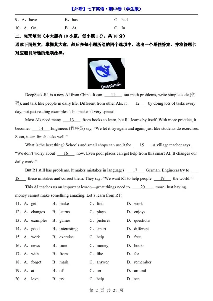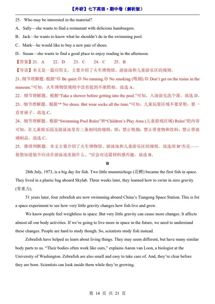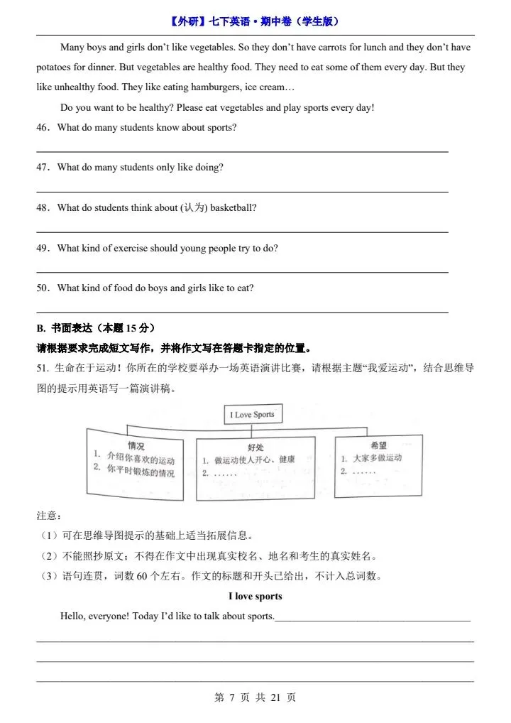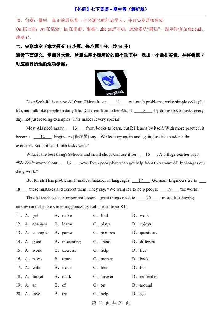26新七下外研版英语期中试卷(答案+答题卡)完整电子版可打印