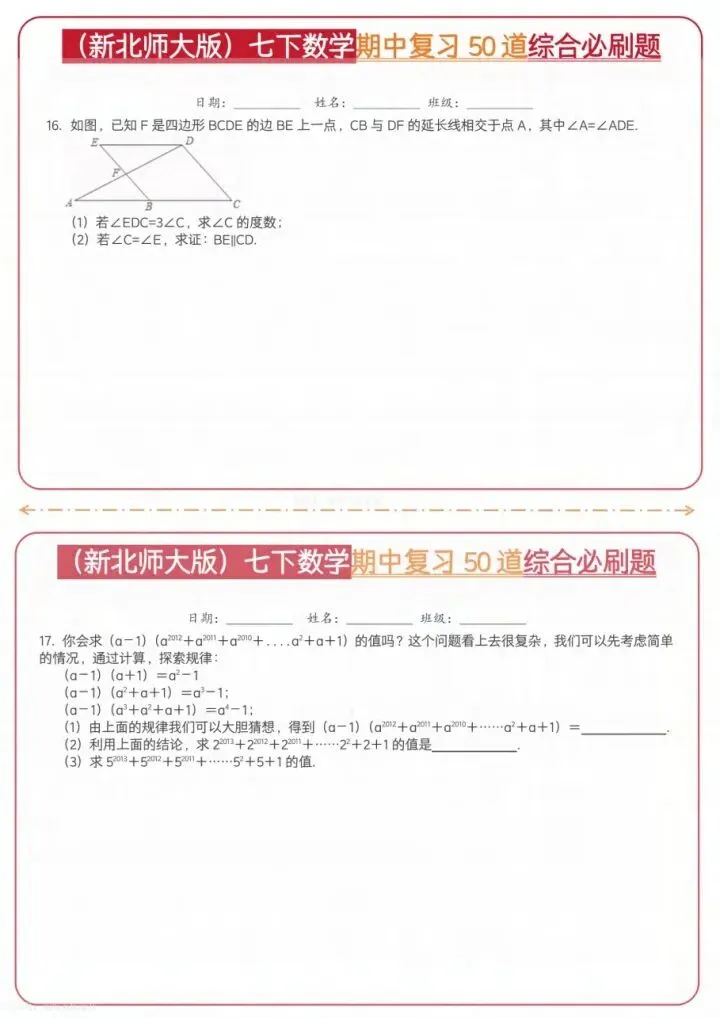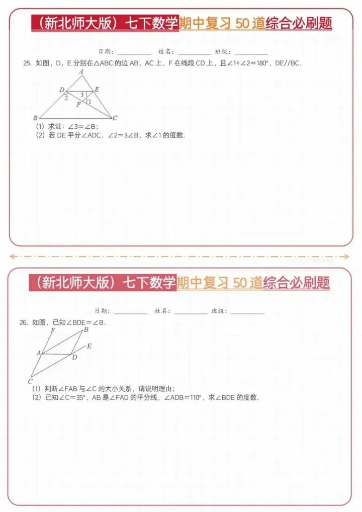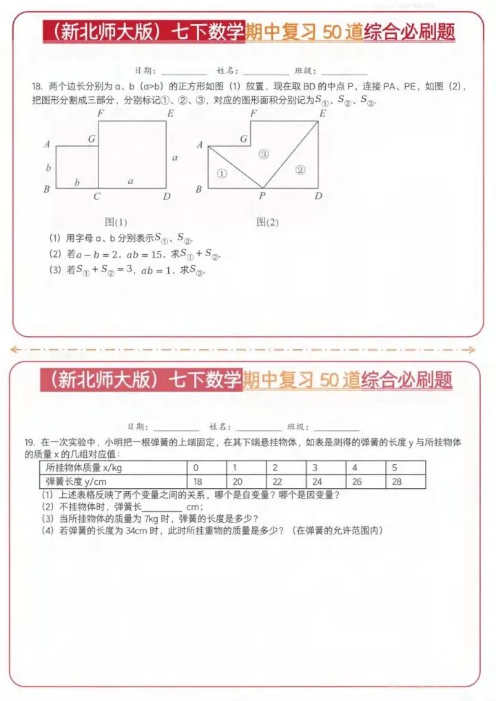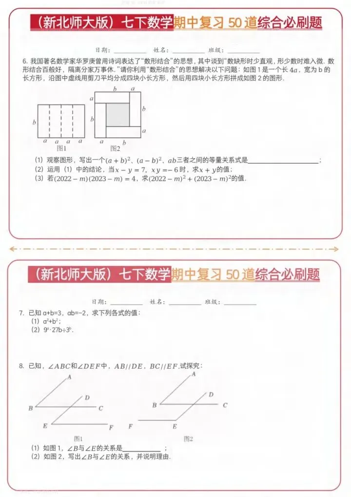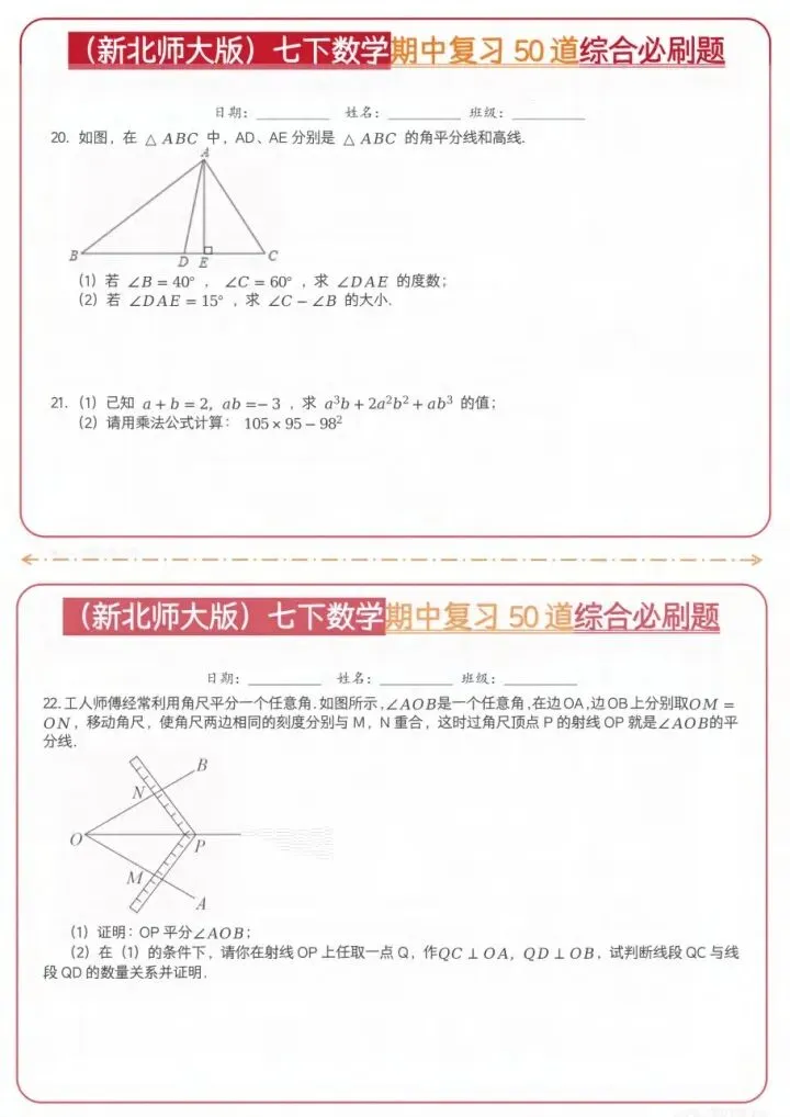 今日分享26新七下数学北师期中50道综合题(完整电子版可打印)!高清可打印,每日轻量练习,拒绝无效刷题,用系统化资料筑牢学科基础,让假期成为提升的黄金期,开学轻松领跑。