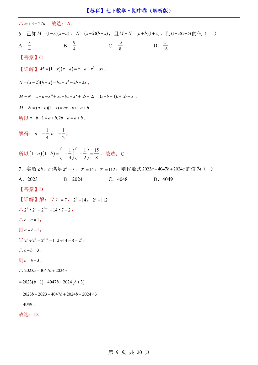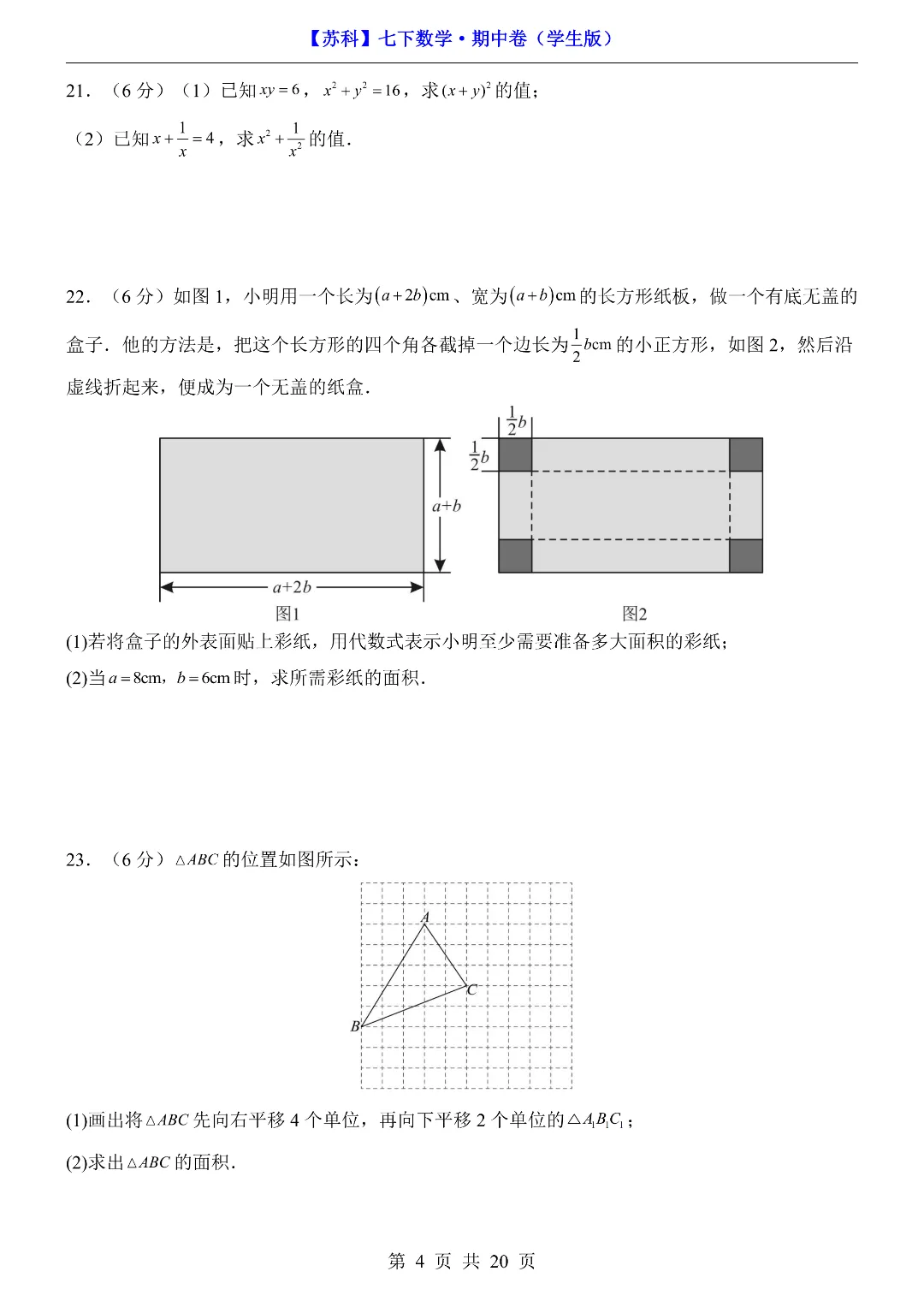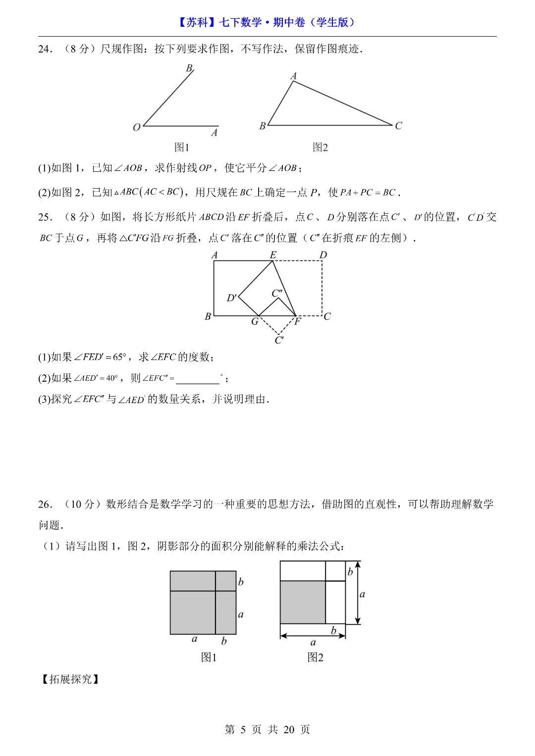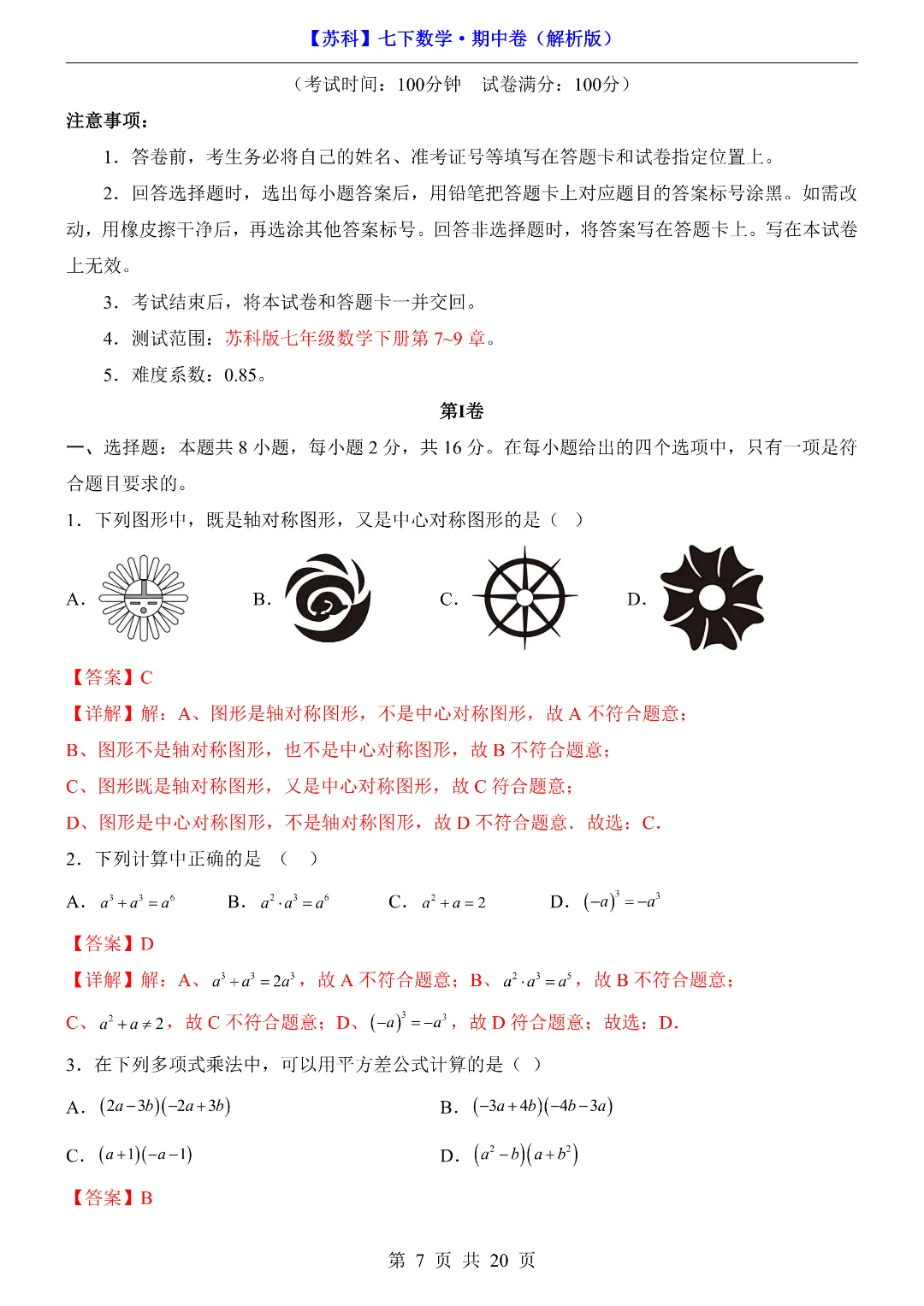 今日给家长朋友们分享的是:2026年新七年级初一下册苏科版数学《期中模拟测试卷》含答案解析‖电子版可打印