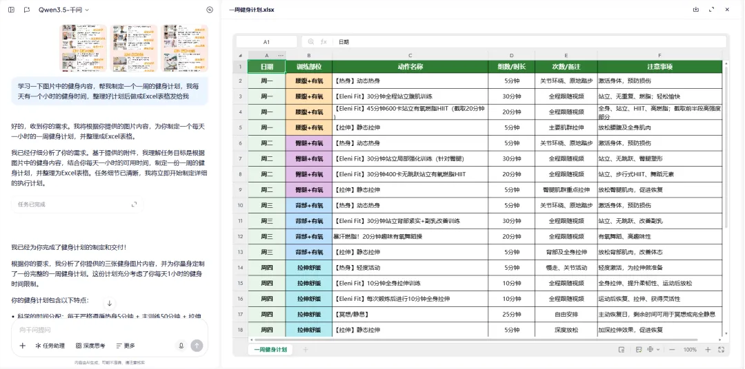 比如这个一周健身计划,小编先是在网上找了自己比较喜欢的内容,然后发给千问,让千问根据图片上的内容来生成专属我个人的健身计划。