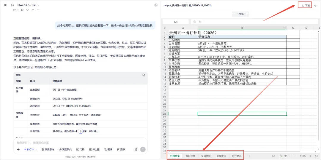 比如小编跟千问经过多轮沟通后制定的五一贵州旅游计划,一开始的行程很紧凑,还有部分景点不感兴趣,经过讨论后得到了这个明细的Excel表格。