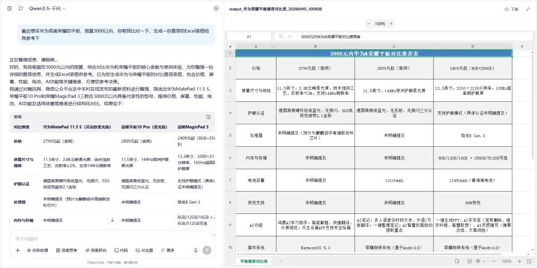 最近小编在考虑购入一个新的平板电脑,预算三千内,钟意华为或者荣耀,于是直接让千问帮我搜集并整理出来一个对比的表格。