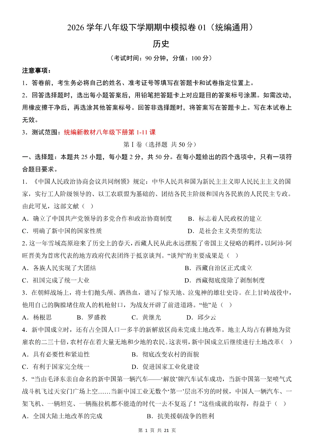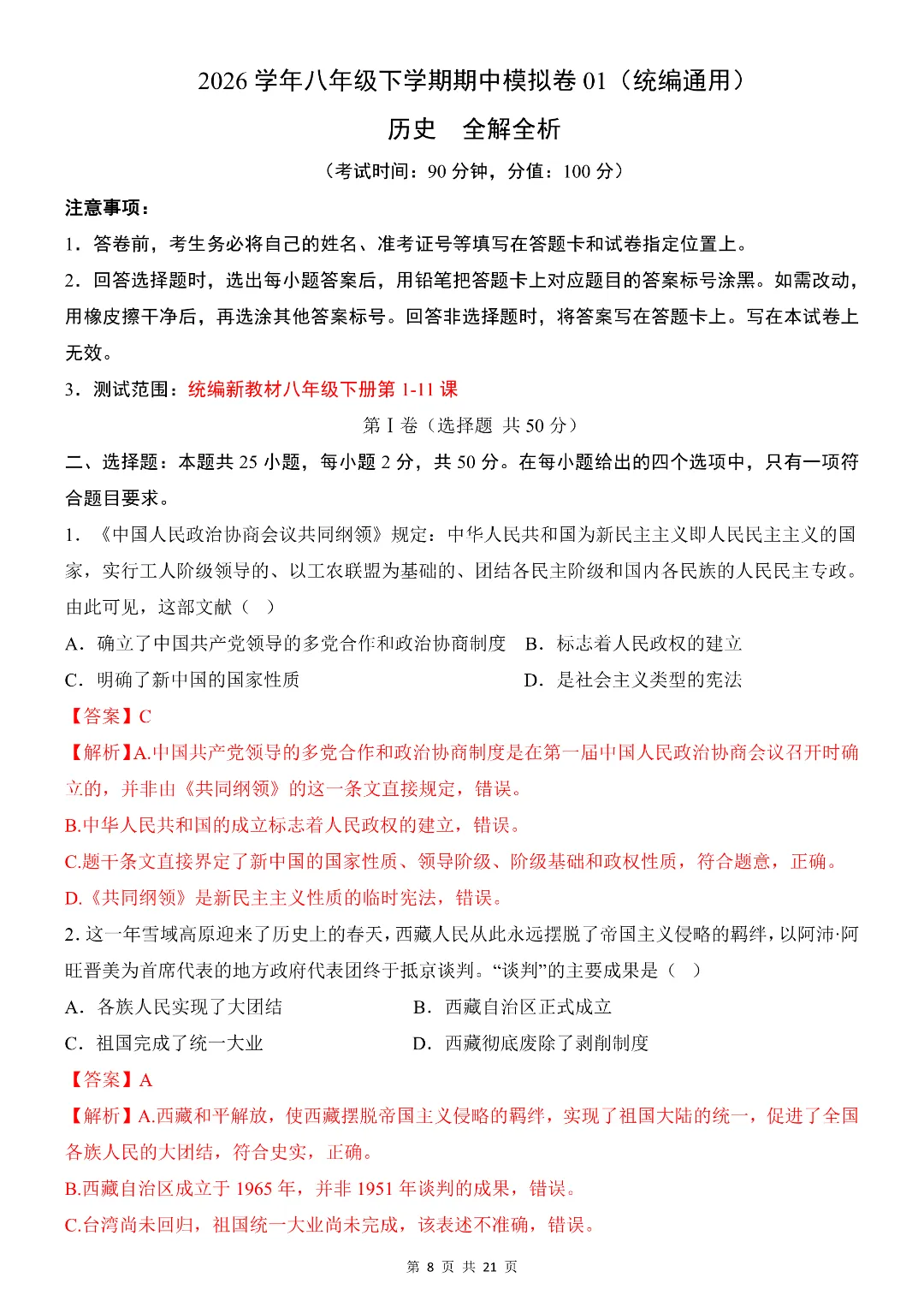 今日给家长朋友们分享的是:2026年新八年级初二下册统编版历史《期中模拟测试卷》含答案解析‖电子版可打印