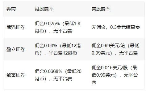 以下是熊猫证券、盈立证券、致富证券在港股和美股交易中的费率对比: