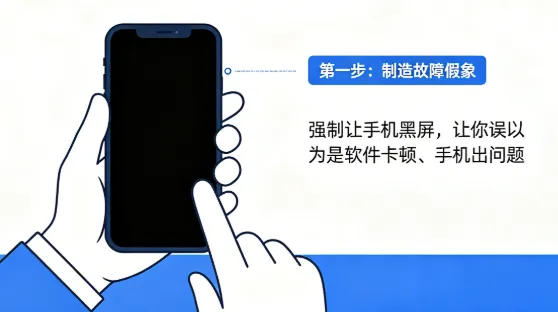 第一步,制造故障假象——强制让手机黑屏,让你误以为是软件卡顿、手机出问题。
