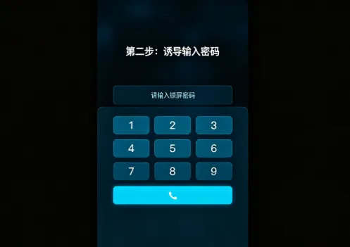 第二步,诱导输入密码——黑屏后跳转至伪造的锁屏密码界面,等着你主动输入密码。