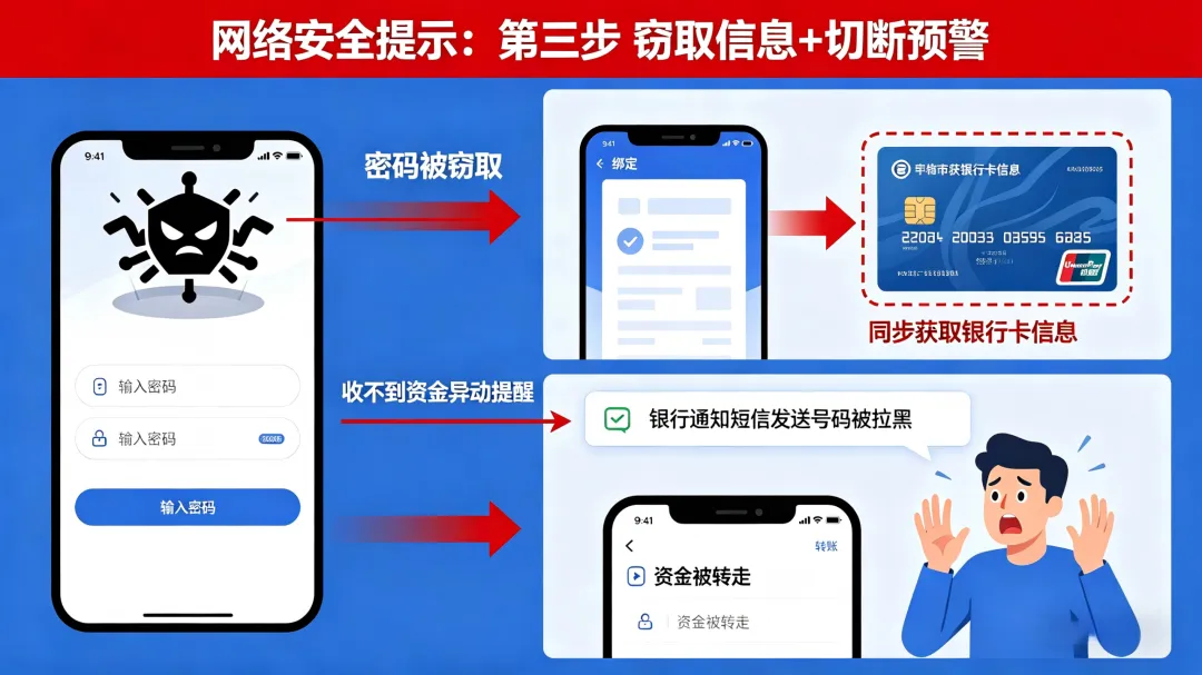 第三步,窃取信息+切断预警——一旦你输入密码,恶意程序就会瞬间窃取密码,同步获取你手机绑定的银行卡信息,同时自动拉黑银行通知短信的发送号码,让你收不到任何资金异动提醒,眼睁睁看着钱被转走却一无所知。