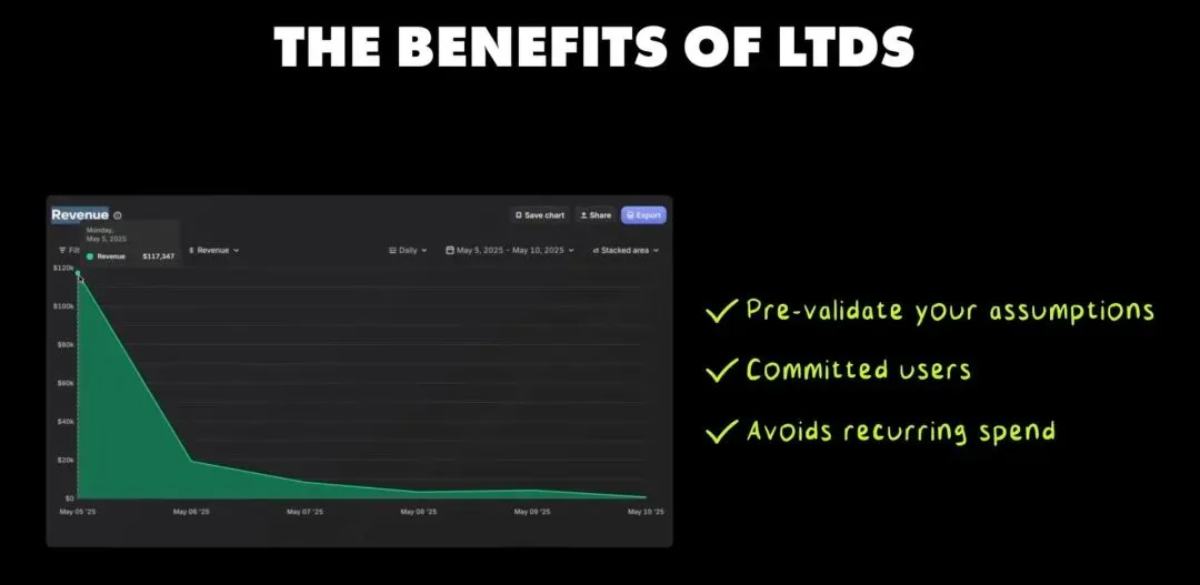 对于这部分用户,他们愿意为终身访问支付的价格,轻松是年订阅价格的 3-5 倍。如果你算一下账,一个用户订阅 24 个月能给你带来多少收入?终身交易的定价完全可以覆盖这个数字,而且是提前拿到手。