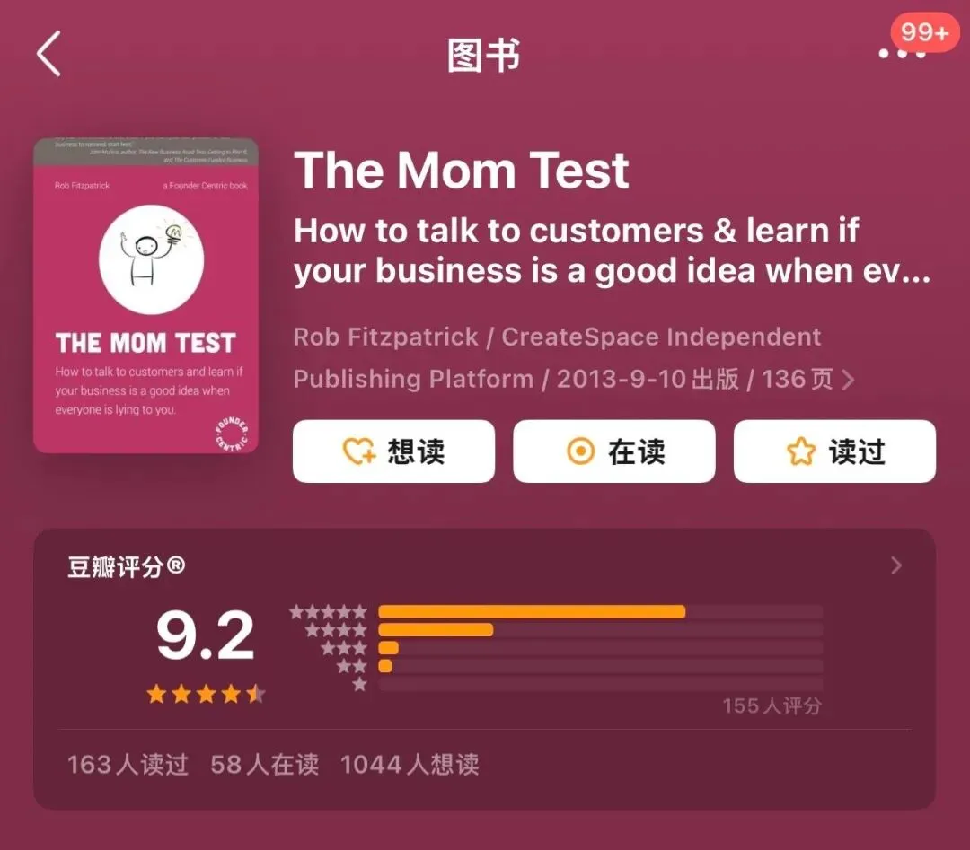 这里作者还推荐了一本经典书籍《The Mom Test》,挖了一下豆瓣居然有 9.2 的高分!还没来得及细看,让 AI 帮忙介绍了一下: