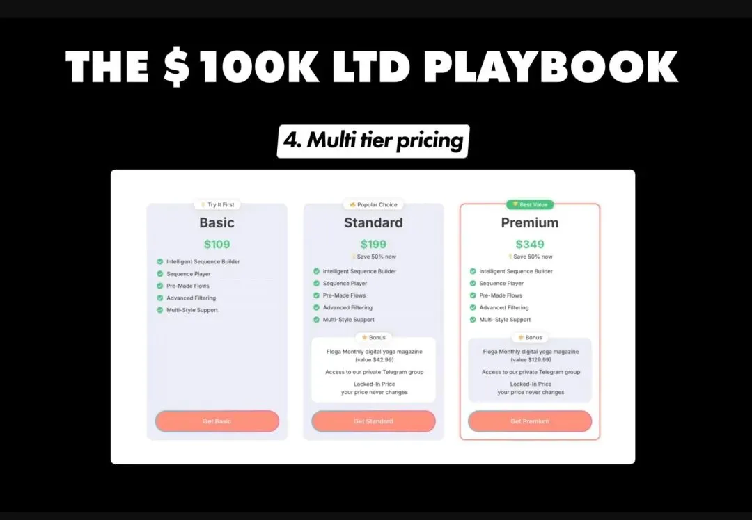 心理学上,当用户看到三个选项时,中间和最高档会显得更有价值。而且 $349 这个价格,对于真正需要这个工具的瑜伽老师来说,完全在可接受范围内。