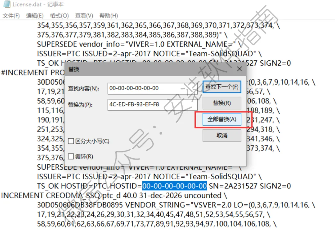 9.查找内容为:00-00-00-00-00-00,替换为:刚刚复制的主机ID,然后点全部替换,最后保存并关闭记事本。