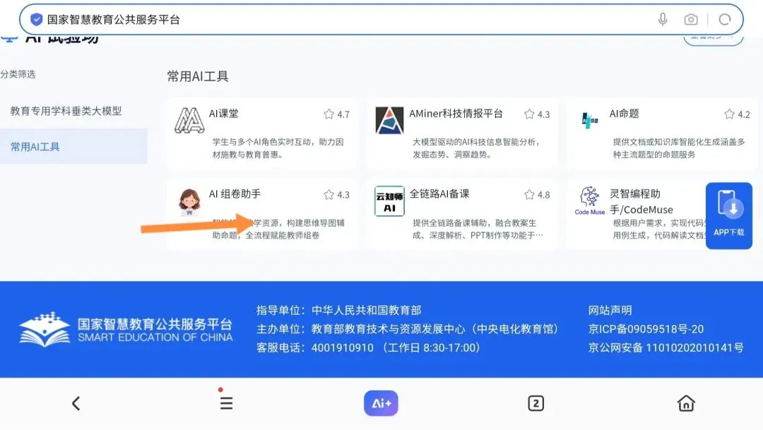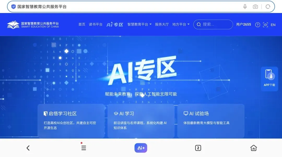 第一步:打开国家智慧教育公共服务平台官网:https://www.smartedu.cn。登入并在首页找到上方的AI专区模块,点击进入。
