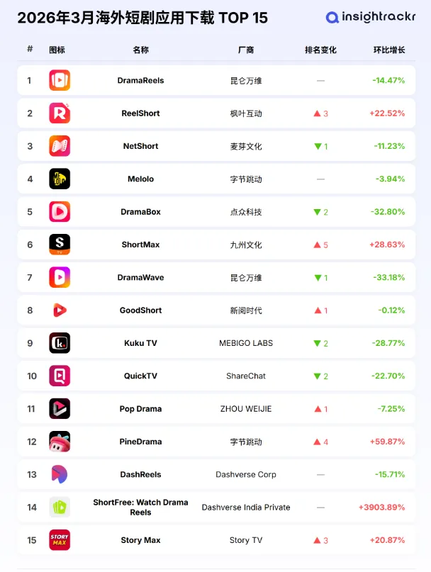 下载量飙升: ReelShort、DramaBox等平台在北美、东南亚屡次登顶应用商店。