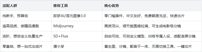 即梦AI|新手首选,零门槛快速出图新手入门最优解,无需复杂操作和精准提示词,3分钟出片。漫剧风格适配高,支持超清优化、参考图导入,免费额度充足;实操标注“漫剧风格+角色+场景”,生成更精准,还可局部重绘调整不满意部位。Midjourney|画质天花板,专业漫剧质感首选画质顶尖,细节和氛围感拉满,适合精品漫剧创作。需通过Discord付费操作(月约70元)、用英文提示词;实操末尾加“manga style, line art, high detail, 8k”+比例参数,保存Seed值可保持角色一致性,避免人设混乱。SD+Flux|自由可控,进阶创作者全能工具主打自由可控,适合进阶者批量生产、打造专属风格。SD可自定义漫剧模型、训练专属人设,避免撞脸;Flux提升生图速度和画质,适配竖屏分镜,新手可先用水线版,生成分镜标注镜头角度更贴合剧情。混元图像3.0|腾讯出品,场景&表情包全能腾讯元宝内置工具,一句话生图,中文友好,擅长漫剧场景、四格漫画和表情包生成,免费额度充足;实操标注景深、色彩,画面氛围感更强,适配漫剧对话场景配图。漫小芽|一站式漫剧创作,生图+成片一步到位一站式平台,集生图、剧本扩写、分镜设计、视频生成为一体,无需切换工具。零基础可输入一句话创意,AI自动生成人设、分镜,生成图片后可直接动态化、加配音,一键出漫剧成片,省时高效。写在最后建议从免费额度入手尝试,找到顺手工具深耕,做漫剧更高效!收藏本文按需取用,关注我,后续分享更多漫剧干货~