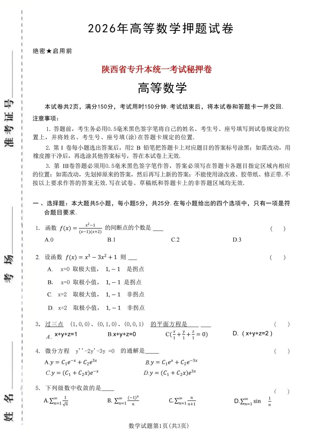 2026 陕西专升本数学|考前押题卷(可直接打印)