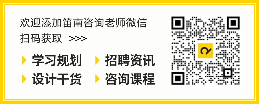 ◎ 欢迎添加笛南咨询老师微信丨扫码获取学习规划、招聘资讯、设计干货、咨询课程