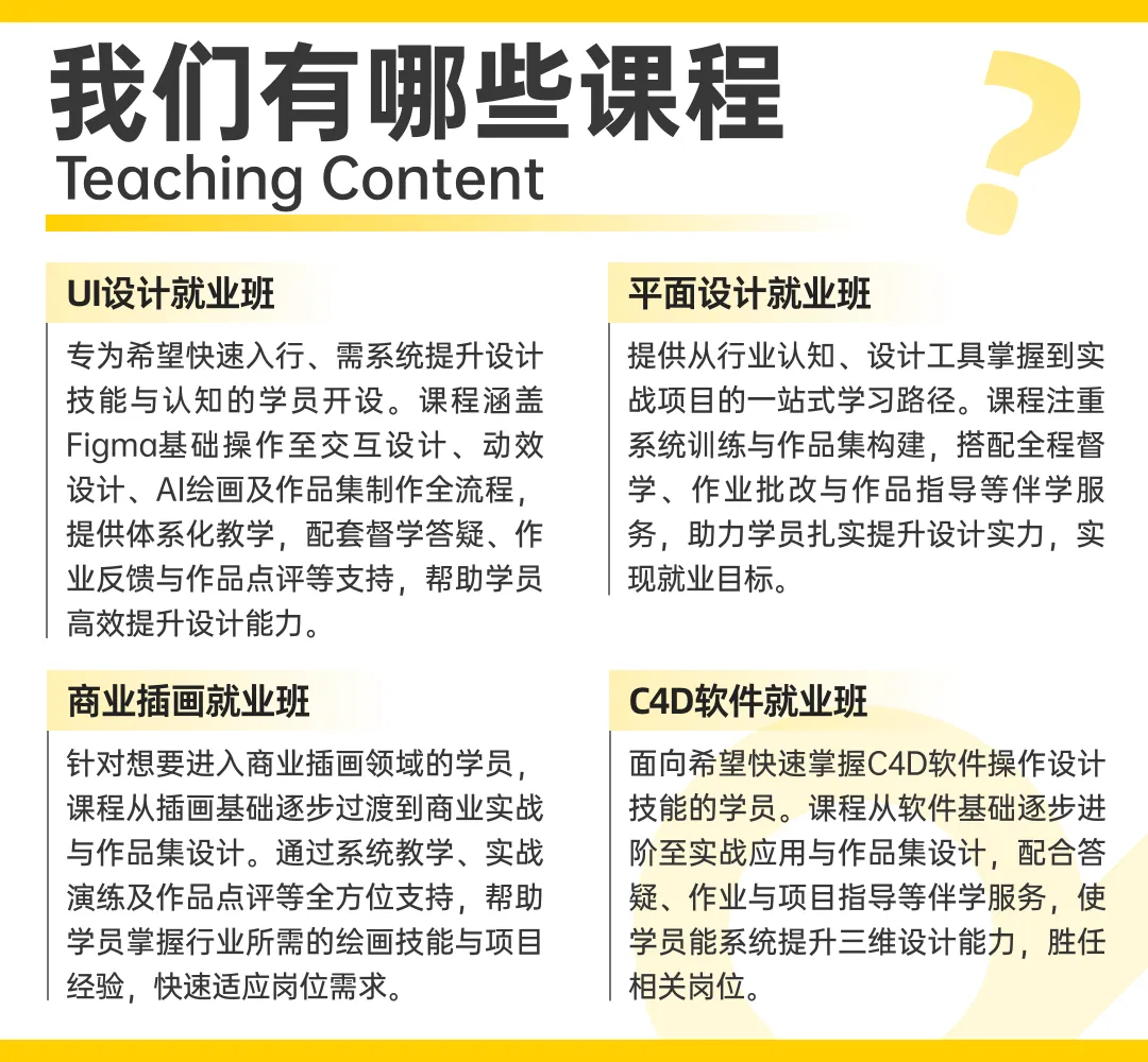 依托对设计市场与岗位能力的持续洞察,将企业对设计的真实需求转化为可训练的能力模块,让你所学的都直接指向设计职业能力的完整构建
