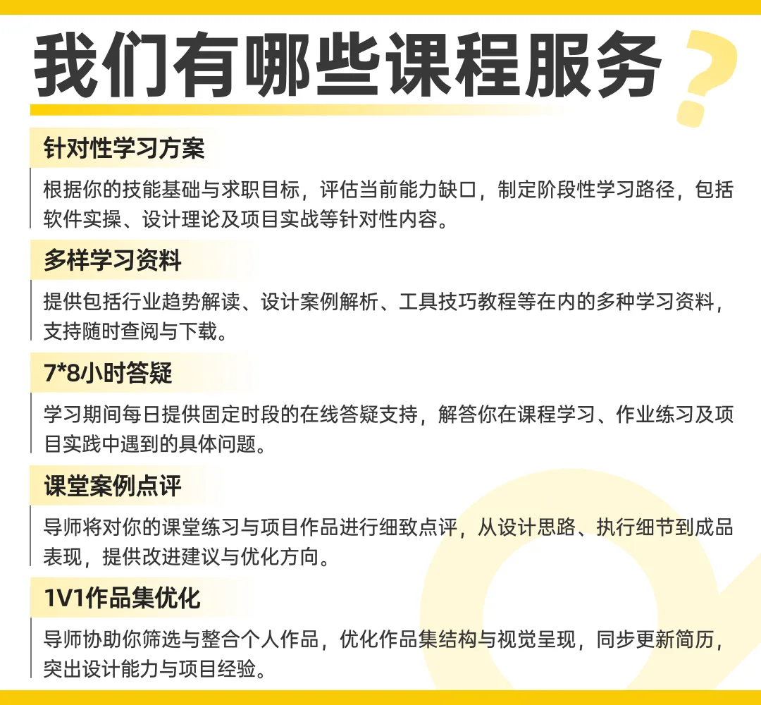 课程注重系统训练与作品集构建,搭配全程督学、作业批改与作品指导等伴学服务,助力学员扎实提升设计实力,实现就业目标。