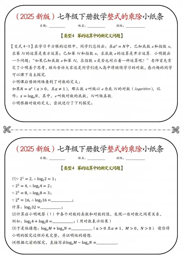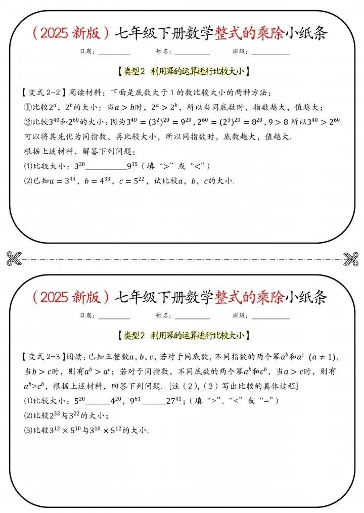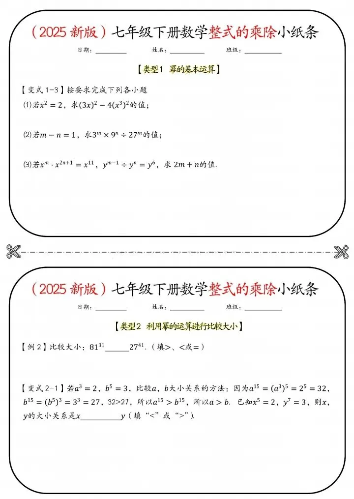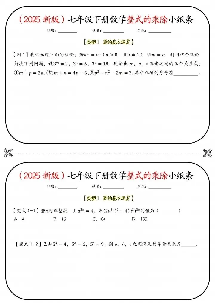 今日分享26新七年级下册数学北师版整式的乘除小纸条(附答案)完整电子版可打印!高清可打印,每日轻量练习,拒绝无效刷题,用系统化资料筑牢学科基础,让假期成为提升的黄金期,开学轻松领跑。