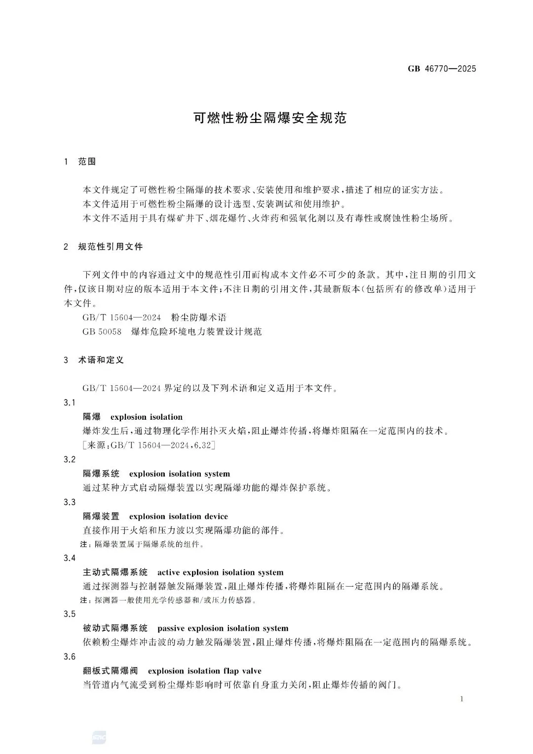 《可燃性粉尘隔爆安全规范》文末可下载 点击蓝字 关注我们 编辑:久运市场培训部 来源:国家市场监督管理总局 国家标准化管理委员会 下载链接: 《可燃性粉尘隔爆安全规范》GB 46770-2025.pdf 扫码关注我们 微信:jiuyunbiaozhunhua