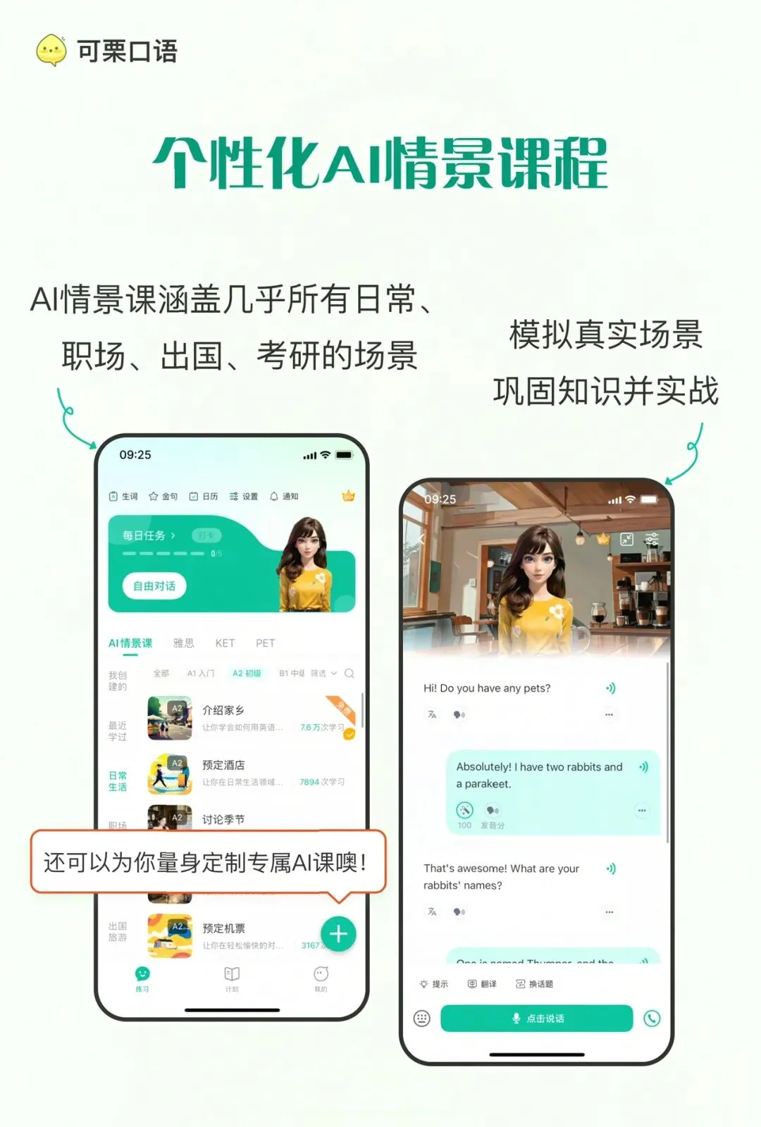 可栗口语覆盖职场商务、雅思托福等专项场景,职场课程包含谈判、汇报等高频场景,雅思模块实时更新真题,还能对回答进行语法、发音、逻辑的全方位评分,据官方数据,使用可栗口语备考雅思的用户,口语平均提分1.2分。