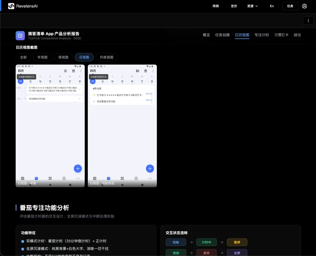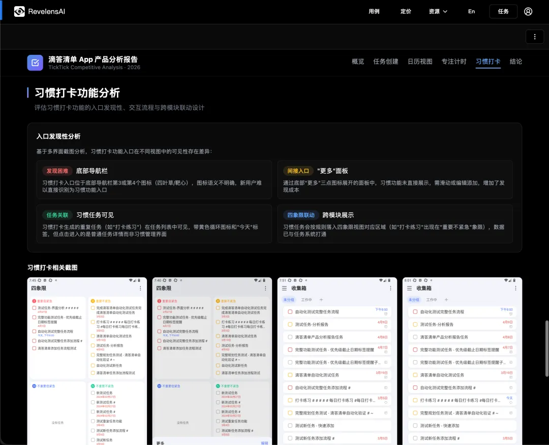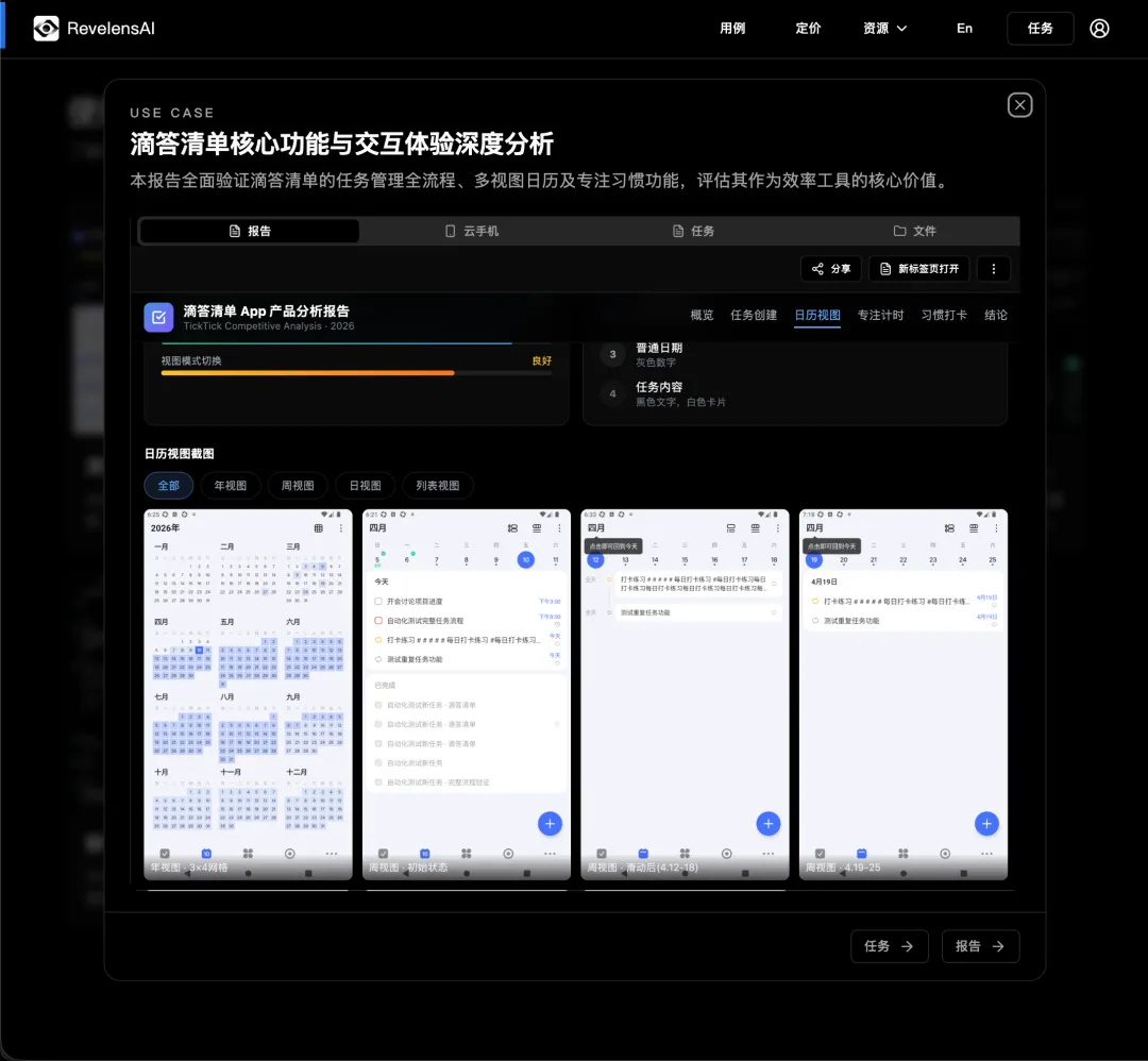 用 RevelensAI 分析了一下滴答清单 APP,打开 RevelensAI 的“用例”就可以看到完整的报告。