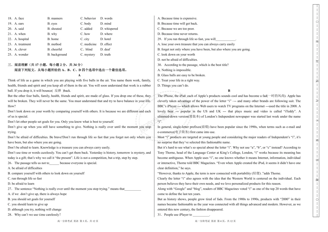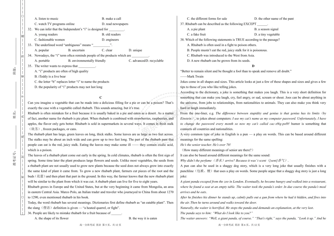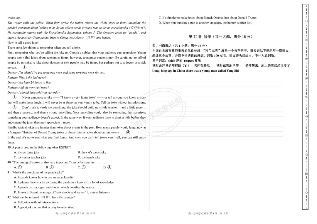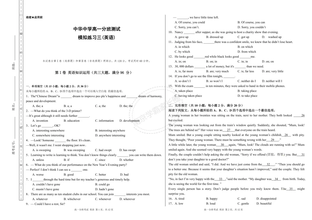 今日分享:南京中华中学新高一分班考试卷,可打印完整版!