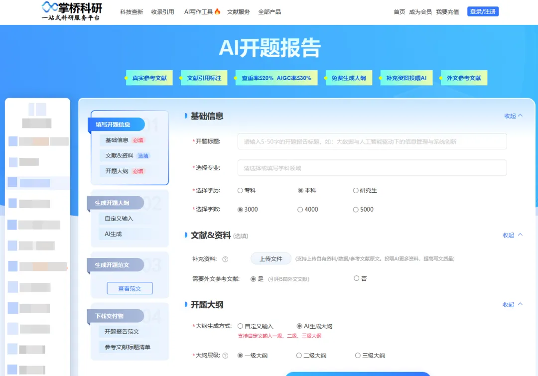而且掌桥科研【AI开题报告】是专门写论文的ai工具,同时开题报告也是单独的一个板块,还支持我们一键免费生成开题报告的大纲。