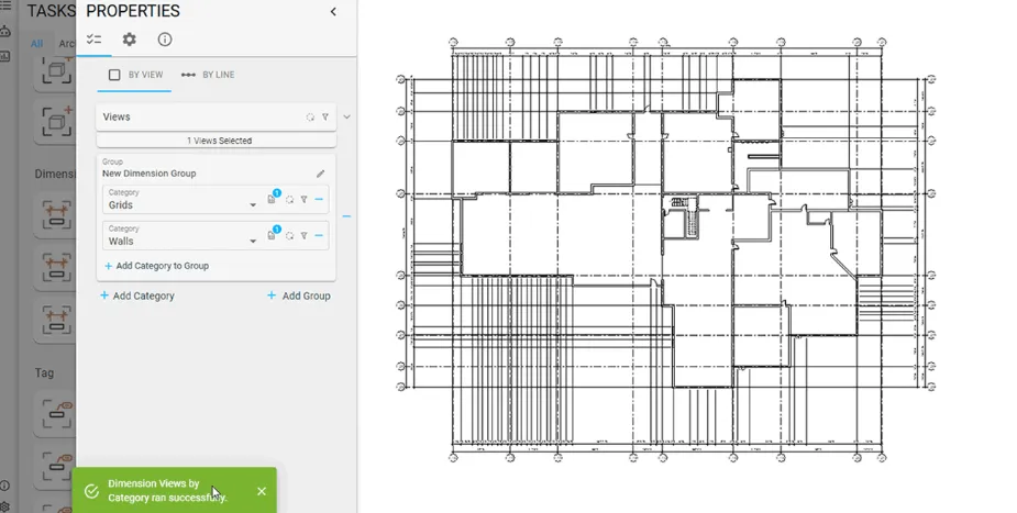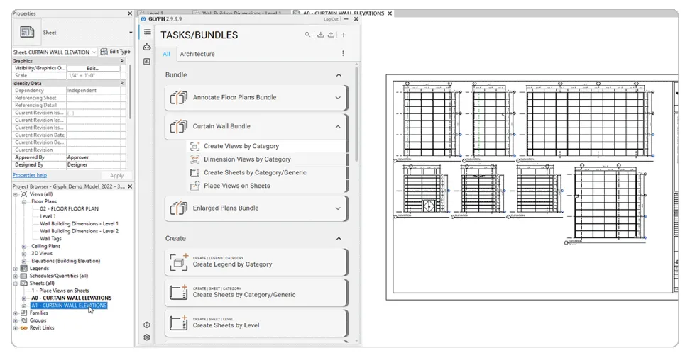 Glyph 使您能够将多个任务(例如,视图创建 + 图纸创建 + 标记 + 尺寸标注)组合成一个单一的“任务包”,您可以一键运行该任务包,并在项目之间重复使用或共享设置。