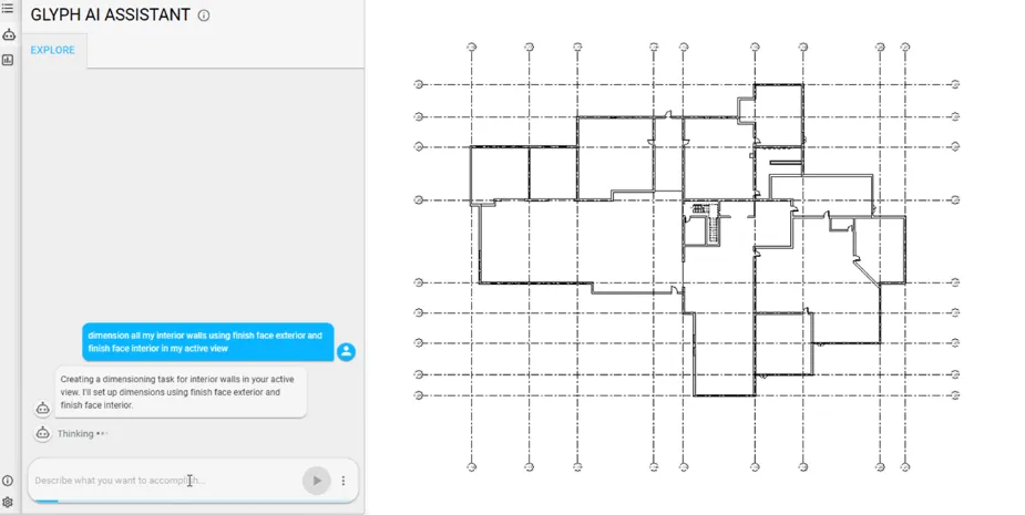 描述您的需求(例如:“为所有内墙添加尺寸标注”),Glyph 就会执行。