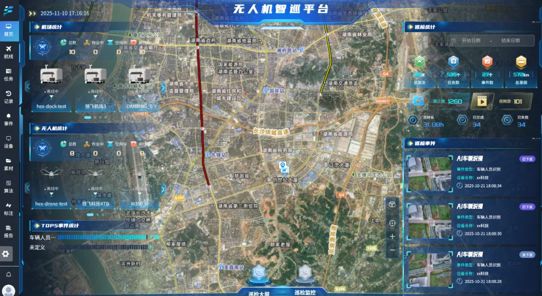 集成多模态大模型、视觉大模型、GSD 空间测算等技术,实现目标自动检测、人车追踪、AI 图片对比、实时告警推送,结合空地联动机制,达成 “发现即识别、识别即处置”,大幅提升巡检精准度与处置效率。