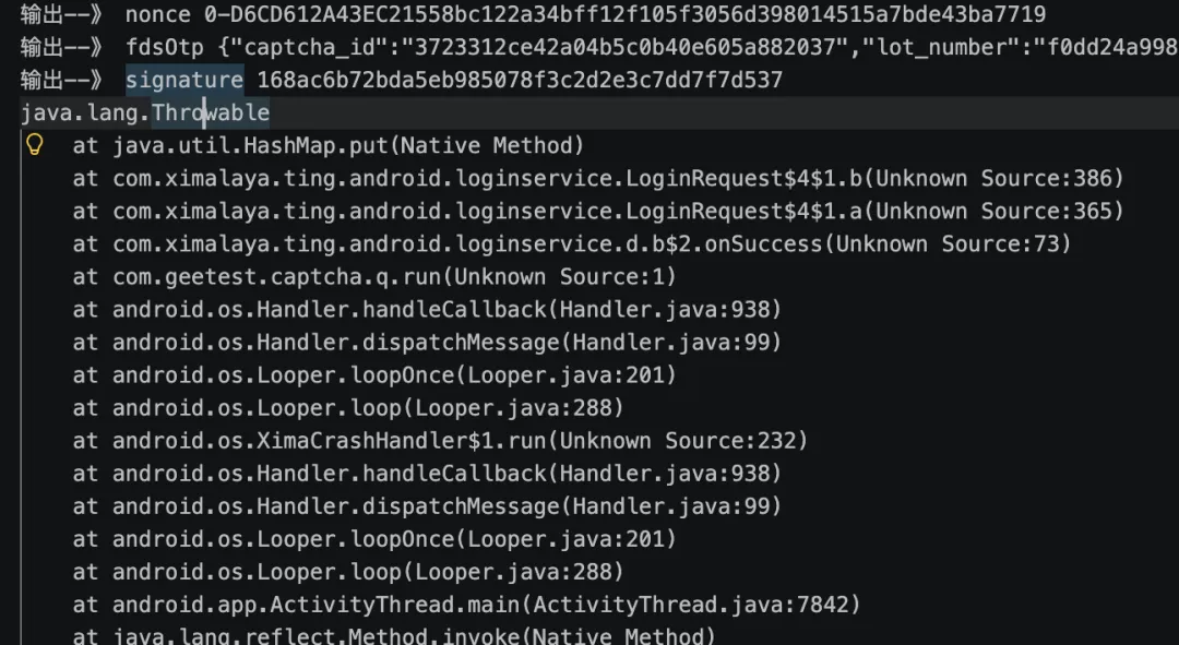 functionmain(){ Java.perform(function () { var hashMap = Java.use("java.util.HashMap"); hashMap.put.implementation = function (a,b){ console.log('输出--》',a,b)if(a=="signature"){ showStacks() }return this.put(a,b) } })}functionshowStacks() { Java.perform(function () { console.log(Java.use("android.util.Log").getStackTraceString( Java.use("java.lang.Throwable").$new() ));})}main()