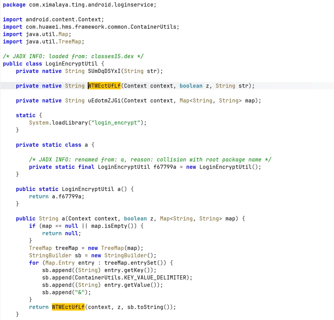 这个WTWEctUfLf是最终加密的位置 so login_encrypt 是使用frida hook WTWEctUfLf,参数是