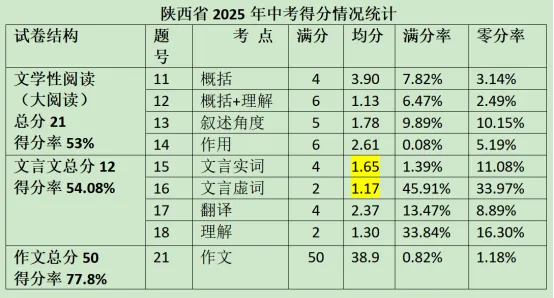 大阅读和作文是所有人公认的难点。下面这张图,是陕西省考试院公布的全省2025年考试文言文、大阅读、作文得分数据。
