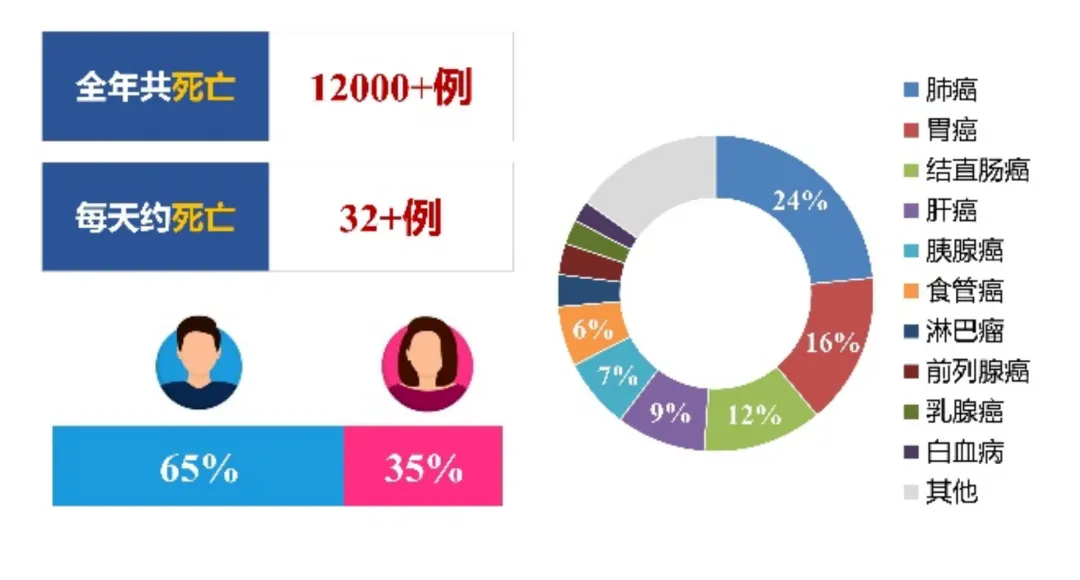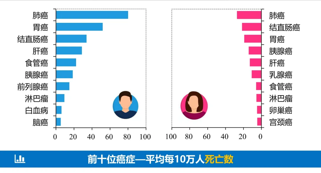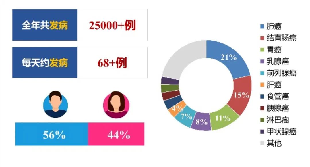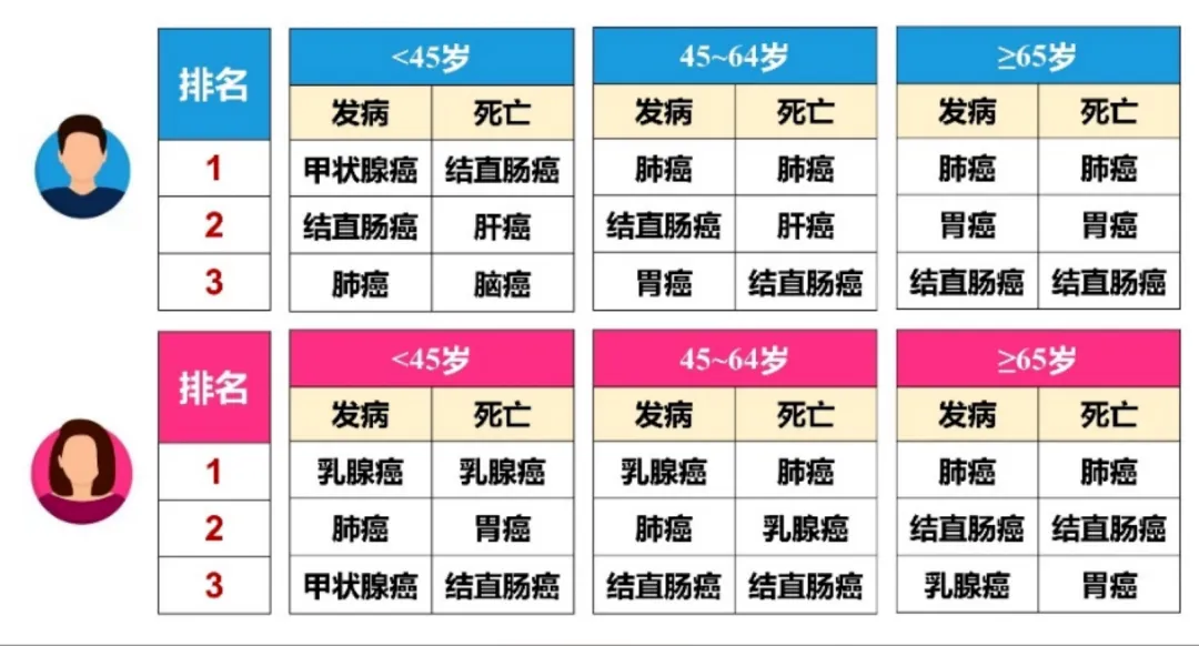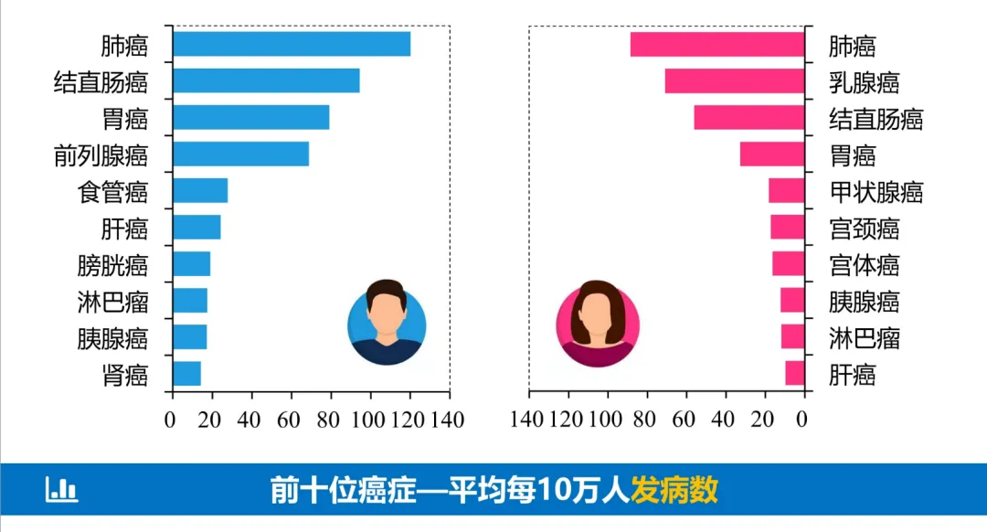 男性癌症发病前5位分别为肺癌、结直肠癌、胃癌、前列腺癌、食管癌;女性癌症发病前5位分别为肺癌、乳腺癌、结直肠癌、胃癌、甲状腺癌。