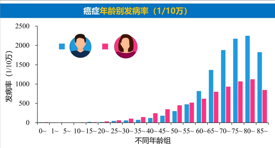 发病:45岁以后癌症发病率呈快速上升趋势;在≥60岁以后,男性癌症发病率高于女性;男女癌症发病率的峰值均在80~84岁。