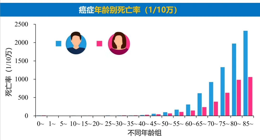 死亡:55岁以后癌症死亡率呈快速上升趋势,且男性癌症死亡率高于女性,特别在≥60岁中,男性癌症死亡率已达到女性的2倍以上;男女癌症死亡率的峰值均在≥85岁。