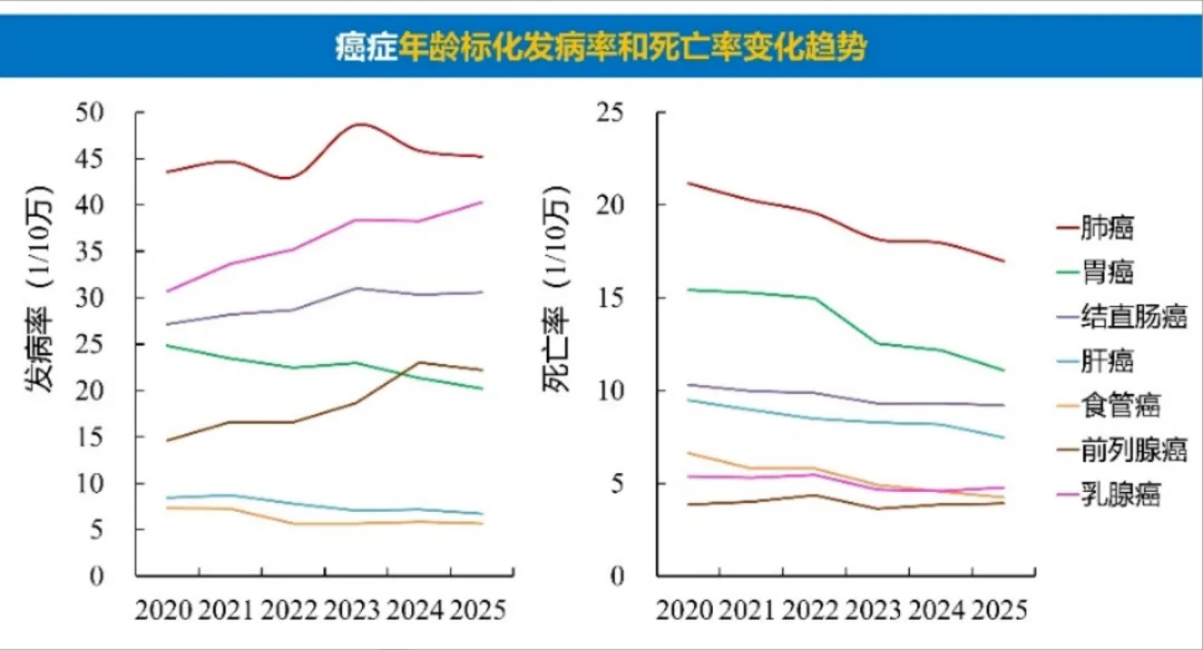 ◾ 肺癌、结直肠癌、前列腺癌和乳腺癌年龄标化发病率上升势头有所遏制。