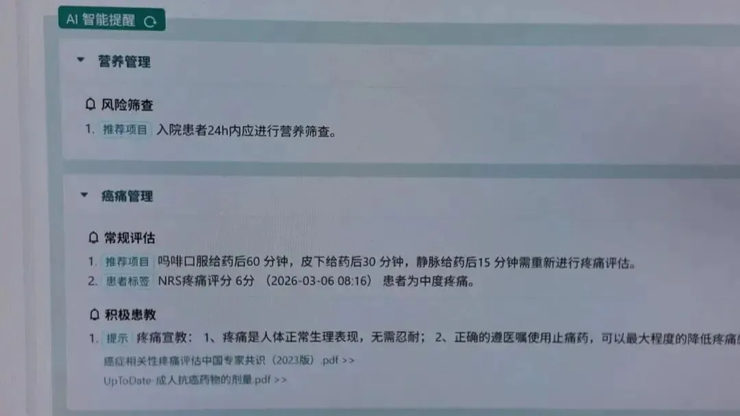 “我们利用AI模型整合国际前沿医学知识,能更便捷地给出风险预警和最优处理方案,最大限度降低患者不良反应发生率。”江南大学附属医院肿瘤内一科主任王腾表示,这也是提升患者治疗舒适度的关键。